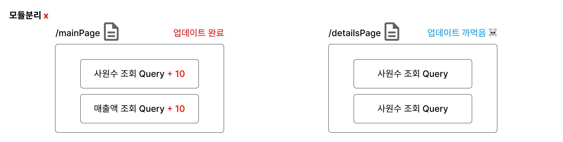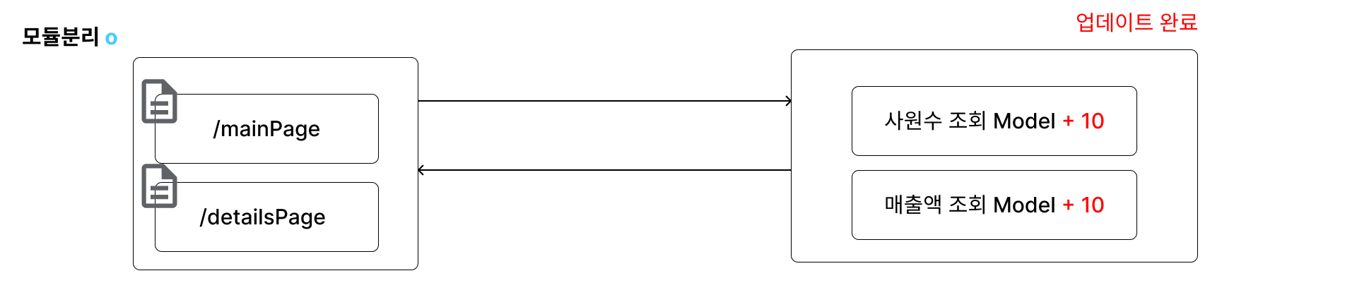 해당 홈페이지에는 메인페이지(/mainPage) 와 상세페이지(/detailsPage)가 있다. 두 페이지에는 동일하게 매출액과 사원수를 표출하고 있지만, 각 페이지 별로 데이터를 조회하는 로직을 별도로 호출 중이다.