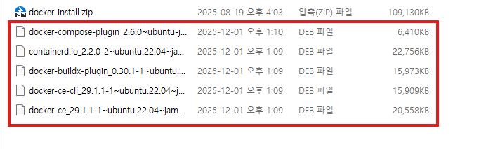 상기 5개의 파일을 https://download.docker.com/linux/ubuntu/dists/ 에서 다운받으면 된다고 한다.
