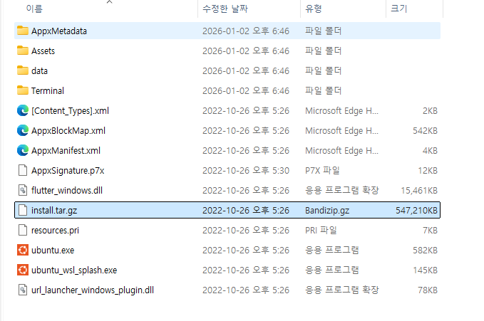 압축을 푼 이후 해당 디렉토리에 들어가 `Ubuntu_2204.1.7.0_x64.appx` 를 다시 `zip` 확장자로 변경하여 압축을 풀어야 한다.