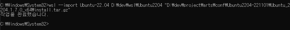 wsl --import Ubuntu-22.04 C:\WSL\Ubuntu2204 "{실제 install.tar.gz 경로}"