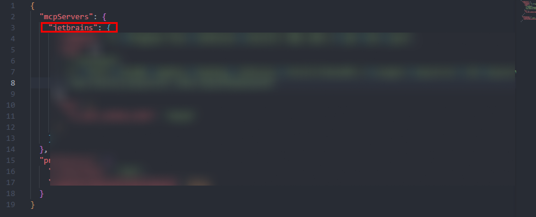 연동이 잘 되면, 실제로 설정 json 파일에 다음과 같이 자동으로 jetbrains mcpServers 설정이 들어가 있어야 한다.
