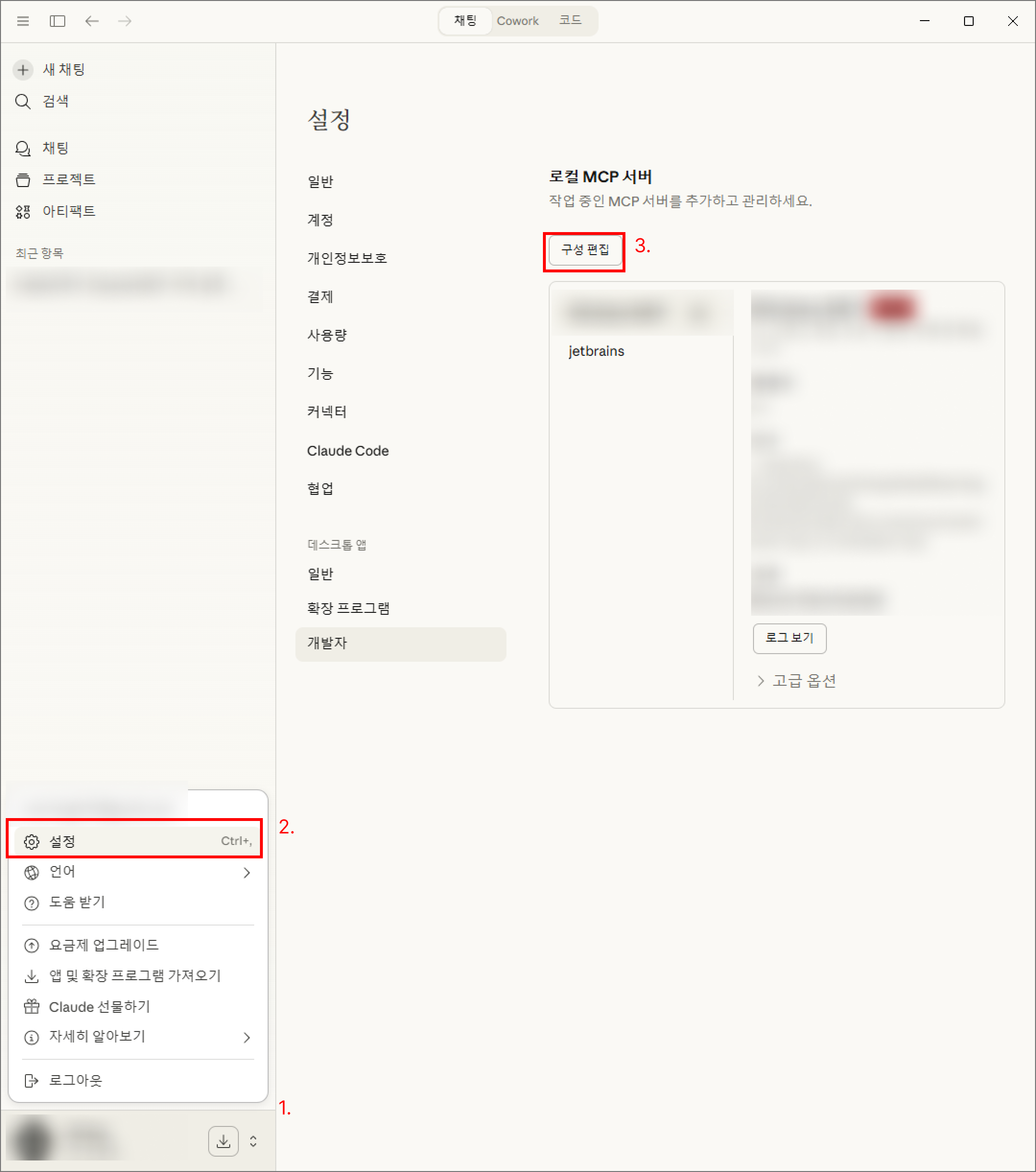 여러 글들을 보니, 왼쪽 하단 설정 > 개발자 > 구성 편집 을 눌러 ` claude_desktop_config.json` 을 확인해보라고 했다.