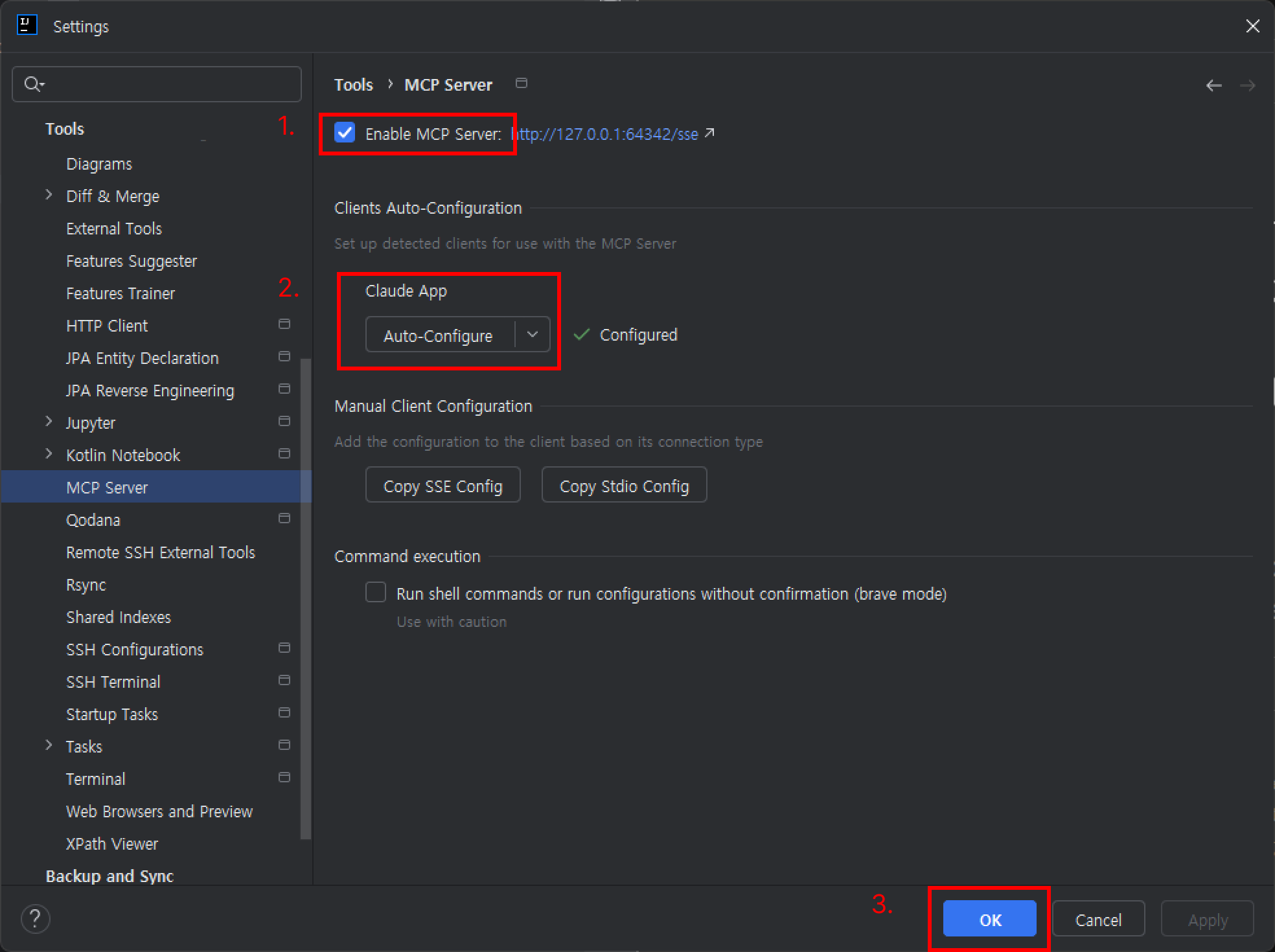 `Enable MCP Server` 체크 > Clients Auto-Configuration 하위 Claude App `Auto-Configure` 클릭